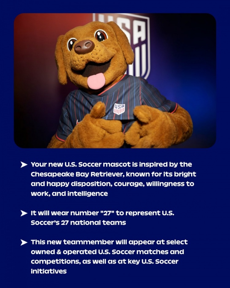 美国足协介绍,该吉祥物寓意其性格开朗、勇敢、勤奋且聪慧。吉祥物将身披“27”号球衣,以此代表美国足协旗下的27支各级国字号球队,未来将出席各类赛事及重要活动。