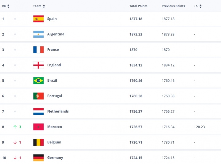 01月20日讯 国际足联更新排名,西班牙仍排名世界第一,阿根廷第二。